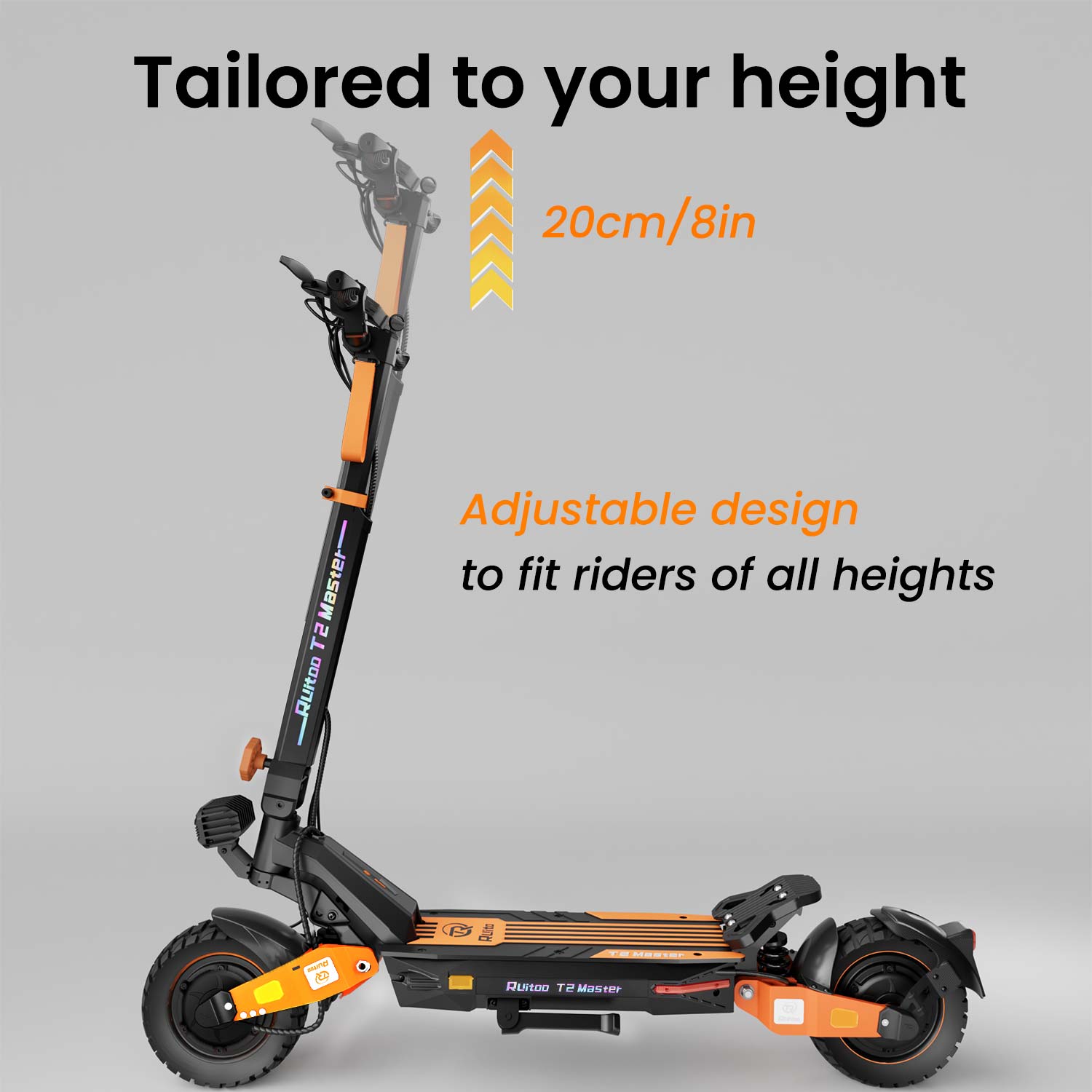 Dotato di pneumatici posteriori fuoristrada da 10", il T2 Master offre una trazione e una stabilità eccezionali su tutti i terreni, garantendo una guida fluida, sicura e piacevole in ogni condizione.