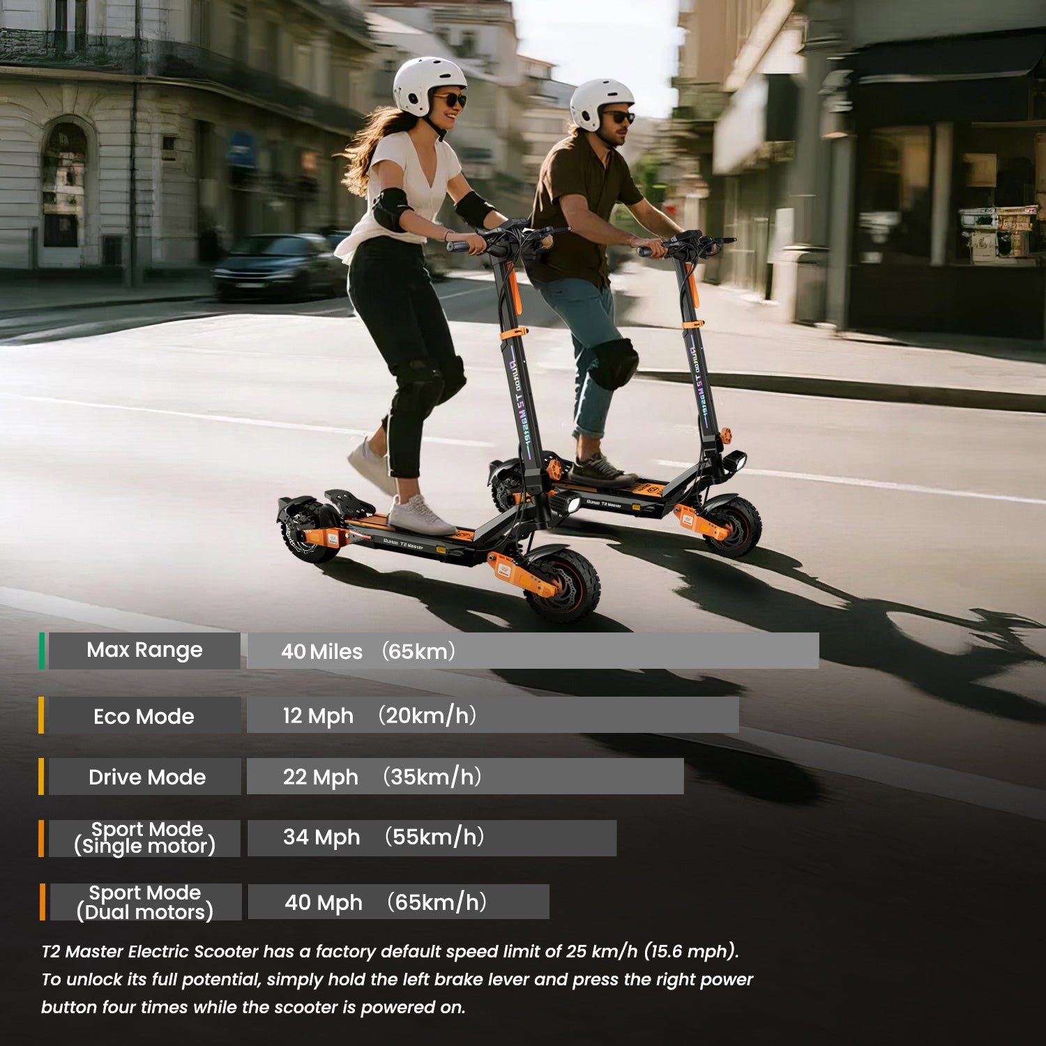 Sperimenta prestazioni ineguagliabili con la Ruitoo T2 Master, progettata per velocità, potenza e controllo. Il suo potente motore, la batteria a lunga autonomia e le sospensioni avanzate garantiscono che ogni viaggio sia fluido, sicuro ed emozionante.